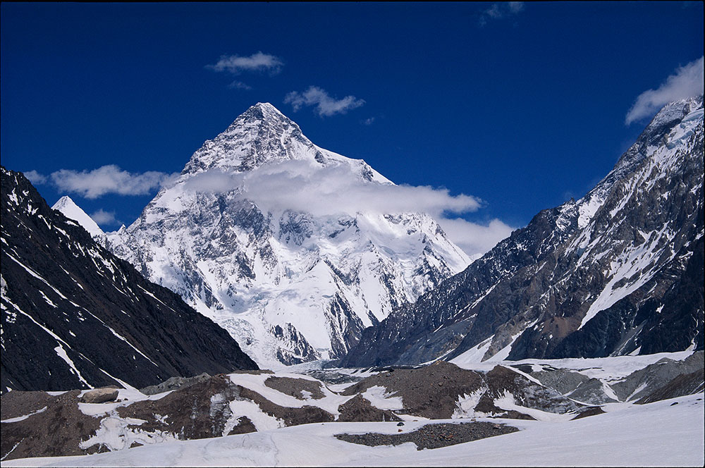 Straddling the Pakistan-China border in the northern Karakoram, it pokes up dramatically from the rock-strewn glacier. At 8611m K2 is a mountain of almost perfect proportions. It soars up over 3000m in a striking pyramid of ice, snow and rock. It is a mountain with no name, just the notation K for Karakoram and 2 because it was the second from the left when it was being surveyed in the early 1800s by the Great Trigonometrical Survey. It feels appropriate that this remote challenging mountain has the brief, stark designation K2.