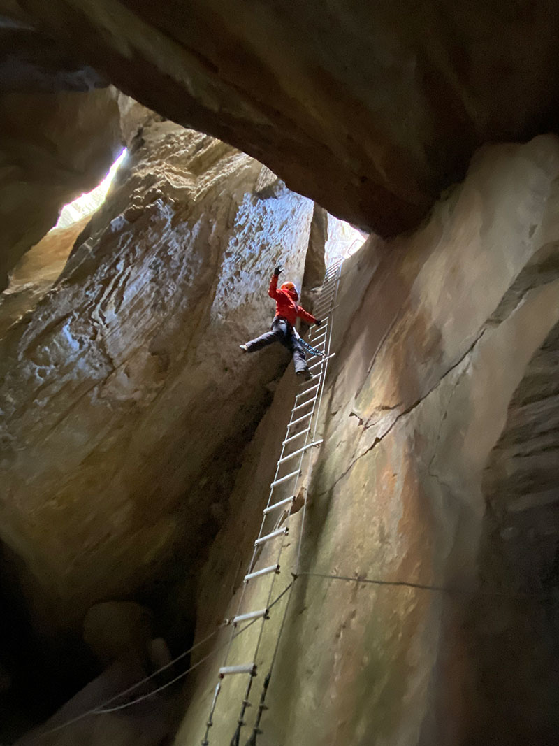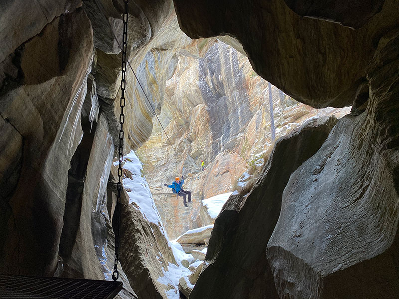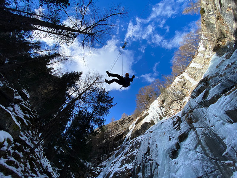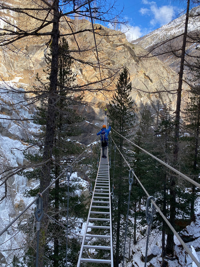 The next morning, Michel introduced us to something more peaceful but still pulse-raising: the Fee Schlucht via ferrata. This is a new-style via ferrata that takes you down the Fee Schlucht, off the old path up to Saas Fee. Constructed by local guides, this is a king of via ferratas. It starts off with attitude: with a heart-in-mouth tyrolean and then never loosens its grip. Suspension bridge follows suspension bridge and ever-escalating tyroleans and rope swings throw you around the gorge and into caves, before a final metal ladder leads to flat ground and a chance to breath. Because of the complexities of the route, you need to book it through the guides’ office in Saas Fee, however it is one of the very best gorge ferratas of its type, and accessible year-round.