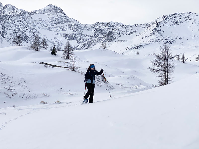 To slow things down, the next day we headed to the Simplon Pass for a snowshoe tour. This snow-sure snow-shoeing (try saying that after après beers) is less dependent on the forces of gravity, and a chance to inhale some quiet air. At 2,000m there is usually snow here and plenty of itineraries explore the plateau around the pass. If you’re feeling keen, you can snap on your touring skis and ski over the mountains back to Saas Fee in eight hours, but most people come here to mix up the gentle trails with a rosti lunch at nearby restaurant Monte Leone.