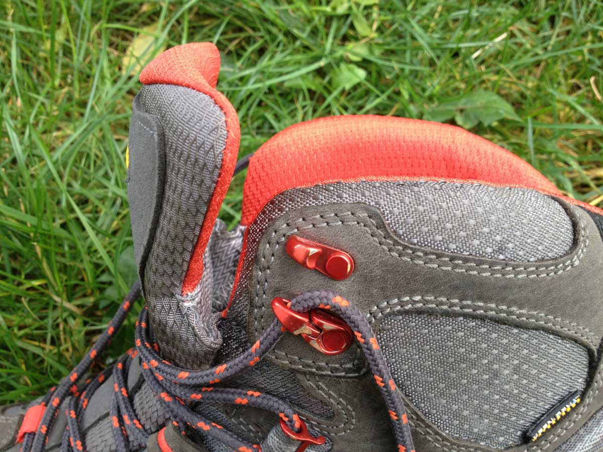 What all this technical stuff means is that, providing the last suits your foot, wearing the Durand feels a bit like walking on carpet underlay in your socks. The well padded ankle, spacious but not over voluminous forefoot, and well positioned lace hooks combined mean fot movement inside the boot is minimal, even on a steep descent. The boot is flexible enough for trail walking yet rigid enough to combine with the grippier black sole compound to give the wearer confidence balancing on the eges for scrambling. In testing on the South Wales Coast it coped with everything from grass to sand and short road sections to woodland tracks and stone littered trails, while in the Peaks and Lakes the Durand was a delight on rockier terrain.