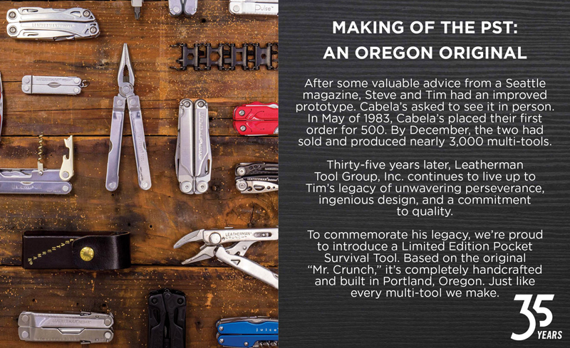 But it was partnering with his college friend Steve Berliner that finally got Tim’s idea off the ground. The prototype was perfected and in May 1983, the first Leatherman order was placed – for 500 PSTs. By December the pair had produced and sold nearly 3,000 products. The Pocket Survival Tool continued to reign supreme until 2004 when it was retired.