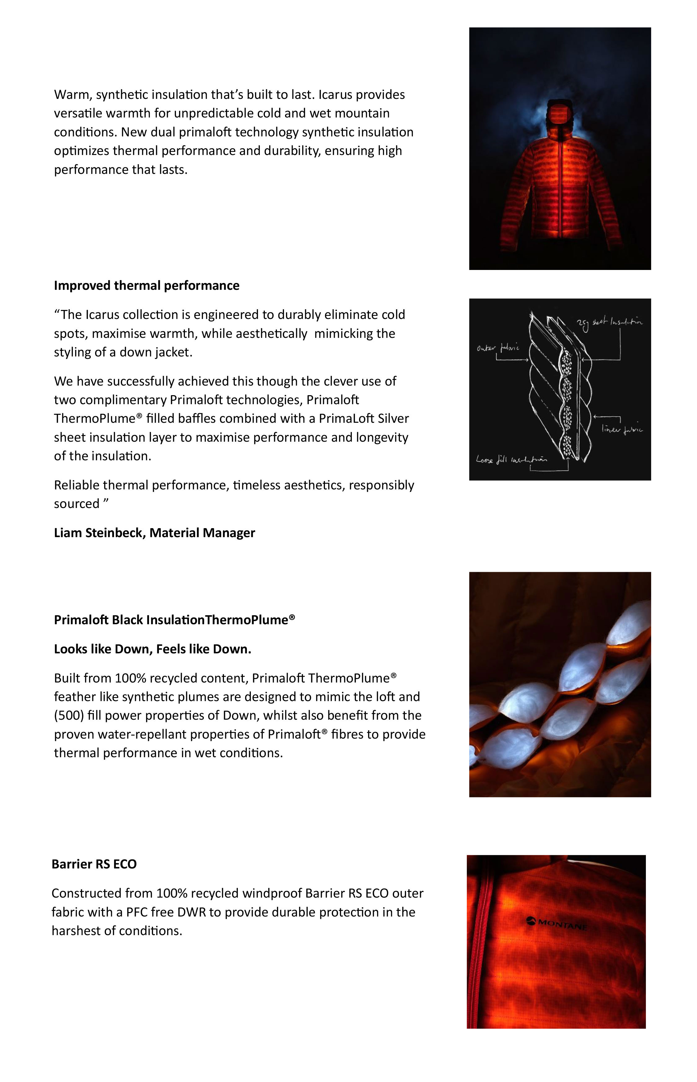 Building on the original design the Icarus now boasts an impressive set of environmentally conscious components along with a new construction that combines Thermoplume, a dowm like sysnthetic, with a Primaloft Silver sheet to minimise migration. We got our first sight of it a couple of weeks ago on the Northumbrian coast and will be testing it over the next couplle of months for a full review. For now, here's an overview of what it brings to the market.