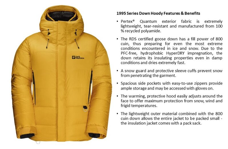 The flagship 1995 Series Down Hoody exemplifies Jack Wolfskin’s commitment to supplying best-performing products in sustainably conscious designs with its extremely lightweight yet and durable Pertex® Quantum exterior fabrics made with 100 % recycled poylamide and RDS-certified 800-cuin fill power goose down insulation with HyperDRY that stays warm in damp conditions and quickly dries.