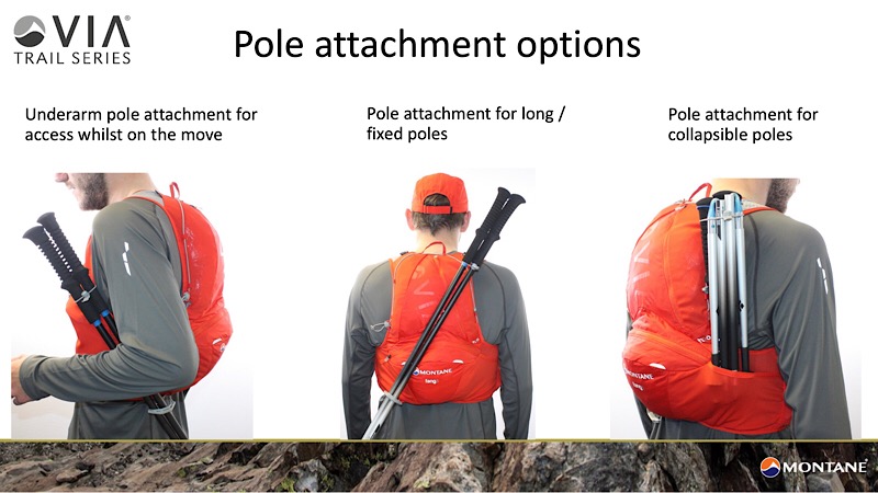 The big “reveal” from Montane was their packs, they have designed them with a full fabric chassis that move and stretch with the users movements. With the various different types of running poles on the market Montane have developed 3 different ways they can be carried / stowed.