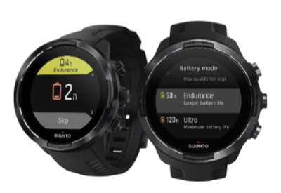 In addition to the battery modes, Suunto 9 uses smart reminders to help you ensure you have enough battery for your next adventure. Some reminders are preemptive based on, for example, your activity history to make sure you are fully charged for the next outing. If the watch notices you are running low on battery during an exercise, it will automatically suggest changing to a different battery mode.