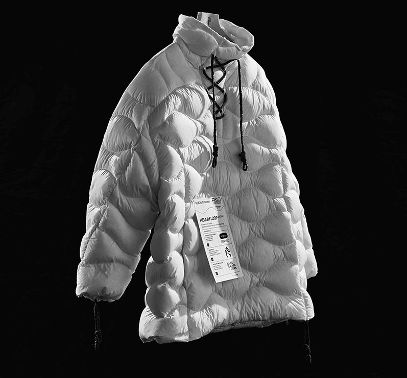ALLIED supplies the 800-fill power down, which is a renewable, recyclable, and biodegradable insulation, making it perfect for this collaboration. NetPlus is fishing net waste, rescued before it pollutes the ocean, re-engineered into 100% PCR nylon yarn. NetPlus yarn is then woven by PERTEX to create the shell and liner for the Helium Loop. Resortecs makes Smart Stitch™, a heat-activated thread that enables easy material separation. At the end of the product’s lifespan, the stitching melts away with Smart Disassembly™ under controlled conditions, allowing the down plumes and shell material to be taken apart and recycled individually.
