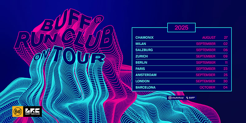 BUFF® is collaborating with some of the most vibrant and influential crews across the continent, including Pizza Run Club (Milan), Salzi Runs (Salzburg), 6:ZH (Zurich), Run’N’Rave (Berlin), Jolie Foulée (Paris), Running Junkies (Amsterdam), Progress Running (London), and Spaceship Running (Barcelona). All run stops (bar the first in Chamonix) are open to the public.