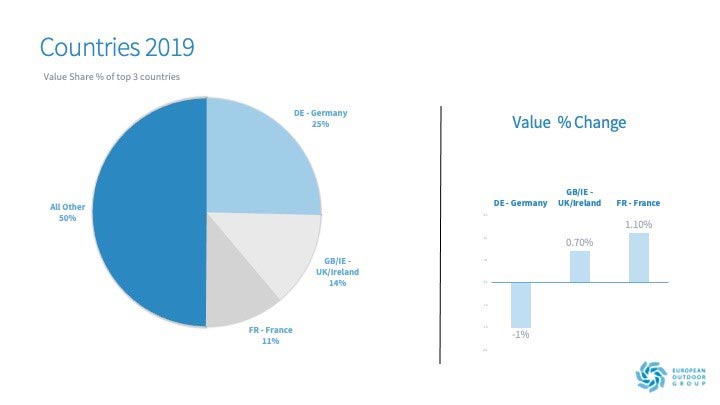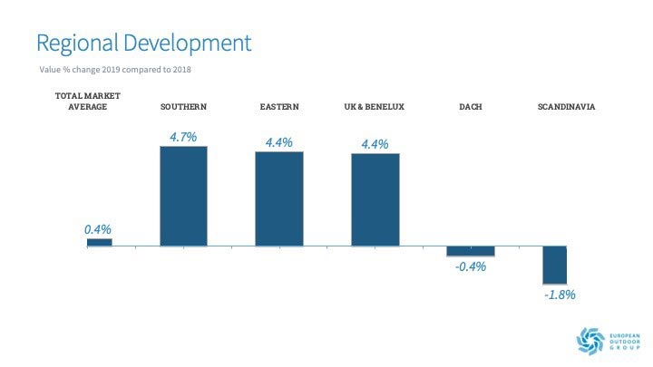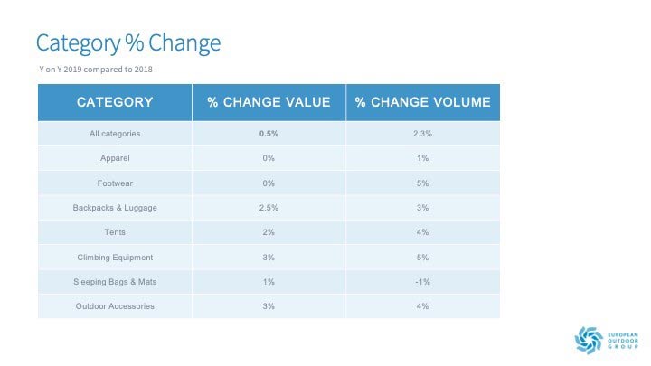 Overall, weather and market conditions had a negative impact on the apparel category, while hardware performed well and climbing continued to grow year on year (continuing momentum after 2018). After a tough previous year, footwear recovered well, with an increase in volume of 4.8%. In general, unit sales outperformed value in the majority of categories.