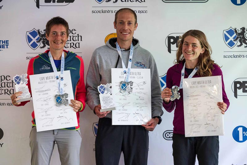 Cape Wrath Ultra 2021 Day 8 the top three l r Sally Fawcett Ian Stewart Lisa Watson copyright No Limits Photography 002Cape Wrath Ultra 2021 - Day 8 - the top three - l-r Sally Fawcett Ian Stewart Lisa Watson - Image © No Limits Photography