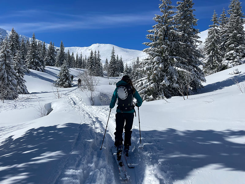 From here we skinned to the entrance of the national park, and up, with all our kit and overnight gear, through pine forests, past a “bear dinosaur cave” set in the mountain and a tree run known as “the snake” as you have to wiggle so much to ski through it.