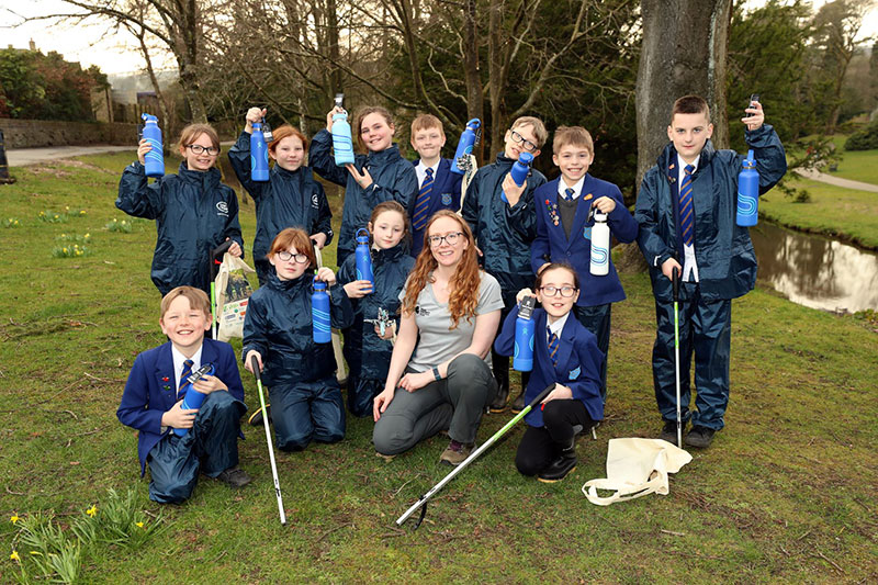 Jackie Wragg with pupils on their litter pick with Hydro Flask bottles
