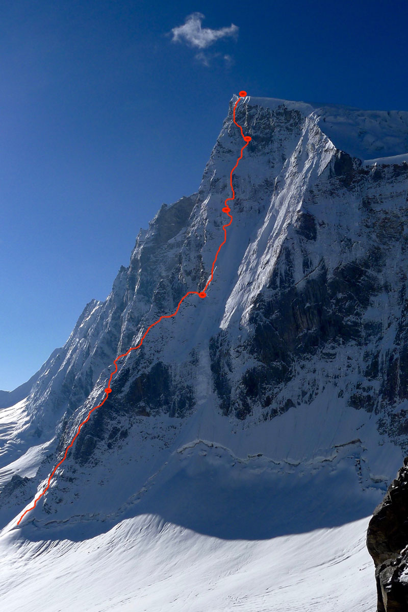 Mick Fowler describes the climb: "We decided that the easiest access would be to trek across the difficult and rarely used 5,000m pass of the Sersank La and descend the far side to the foot of the face. Fresh powder covering the rocks made this exhausting but after overcoming the usual array of Himalayan hurdles (including an unfortunate mix-up of pee and drinking bottles!) we set off up the face on 28 September.