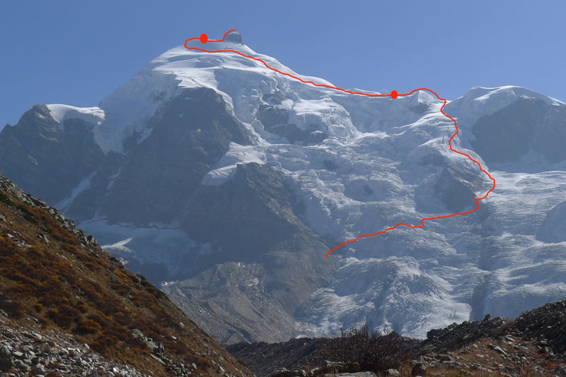 Line shows the route of ascent on Sersank with blobs being bivouacs