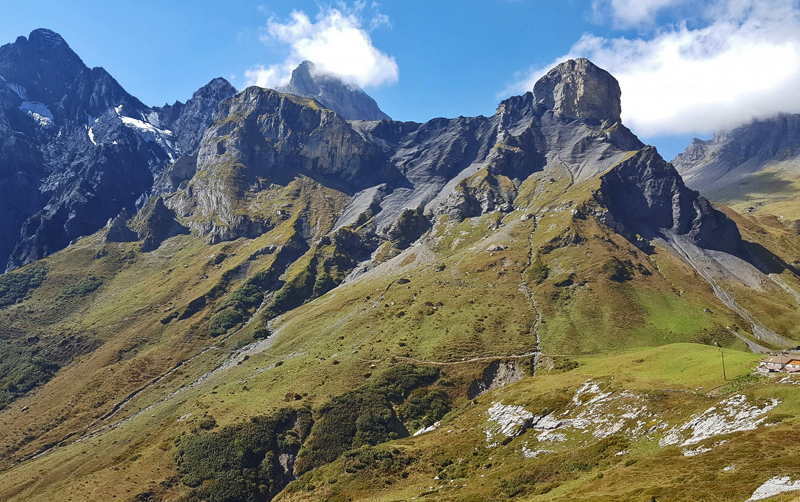 Stopping for lunch by the path, I met up with a chap called Ben from London. He’d been solo walking the whole Via Alpina and we’d walked together down into Wengen the previous day. He had a 70 litre pack on and everything including the proverbial sink in his pack. Hats off to him, but seriously; if you value your knees and want life to be easier, then try and lighten any loads if you do a solo attempt of the Via Alpina. I gave him my poles and this helped him considerably. Despite the town-based living at the start and end of each leg, I can’t stress enough, this is a tough walk!