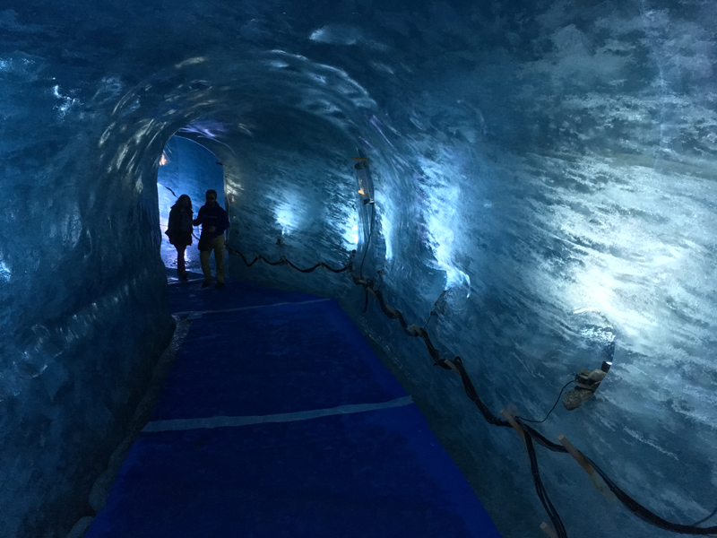 The view is a physical geographer’s paradise, a river of ice snaking its way through jagged rocky peaks. A descent down steps on to the glacier is possible and I would recommend the experience of going inside the glacier. A tunnel has been excavated into the ice making a sparking, refreshingly cold ice grotto. The tunnels are lit with electric lights and even a carpet on the floor – if you step off the carpet you will slide and go head over heels – the ice is very cold and slippery.