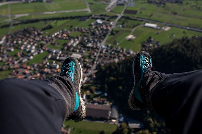 With my guide, Bruno, a freelance instructor working for Twin Paragliding Interlaken, we travelled up in the group minibus up the hill above Beatenberg where he laid out our paraglider on the grassy slope. In the eyes of the Swiss paragliding isn’t deemed an ‘extreme sport’ but rather a form of flight, and as Bruno calmly explained, it would be a short jog off the hillside before sitting comfortably in the seat. As a mountaineer, I had the cold weather kit with me, and I was appreciative of the fact I had worn softshell trousers with merino leggings and my B1 boots, giving me warmth and comfort during the flight. I also had mountain bike gloves on which helped with dexterity, and allowed me to help with taking photographs and even sampling controlling the paraglider in a 360 degree turn!