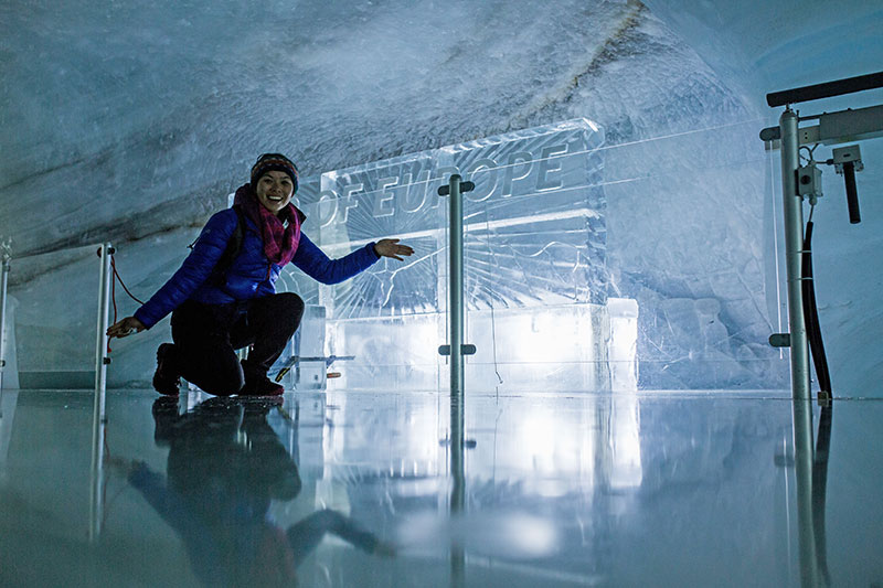 Finally, my trip in Switzerland finished on a high – 3463m above sea level to be exact, as I used my swiss travel pass to board the train from Interlaken Ost, to Grindelwald, then via the scenic route on the regional train – before realising the Eiger Express was the new cable car from the newly opened Grindelwald Terminal, not the train station! A final glossy train from Eigerstation took us to the Jungfraujoch station, some two hours later. Unfortunately, due to the low cloud, a lot of the view was obscured by thick cloud – but it was still impressive to note the outside air temperature ( -9 degrees) and see two inquisitive Alpine choughs, bristling in the cold alpine winds. The glacial bergschrunds could be observed from the viewing platforms, but it was a firm incentive to myself to return to the area – for exciting alpine adventures next time.