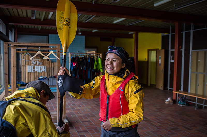 Suited (and booted), we stand in our comfortable dry suits, the equipment modern and clean, and we were handed some neoprene kayak holders that keep our hands warm in case we need it.