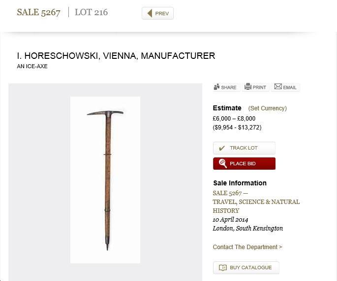 The axe, manufactured in Vienna by I Horeschowski, is believed to have been donated by Ruth Mallory to the Pinnacle Climbing Club and subsequently given to William Threlkel. The ice axe was on loan to National Mountaineering Exhibition at Rheged but is now expected to sell for between £6000 and £8000.