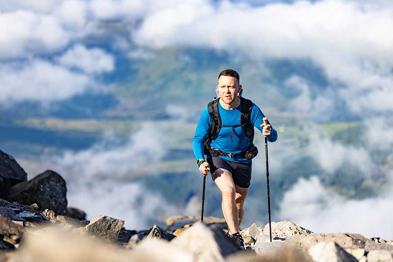 James Forrest cliimbing Ben Nevis, the first of his summits during the challenge