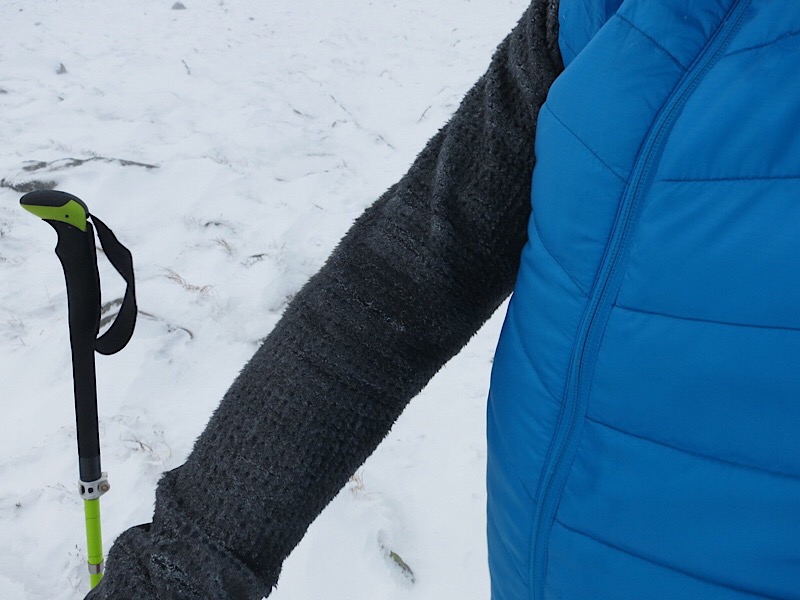 The downside to the open weave is its lack of wind resistance. I have worn it with a thick baselayer in a windy Coire with no shell and there was no chance it could battle with the chill and keep me warm. I also used it with vest / gilet in lesser winds and it worked nicely. Then the spindrift started to stick to it, so it was time to get a shell on.