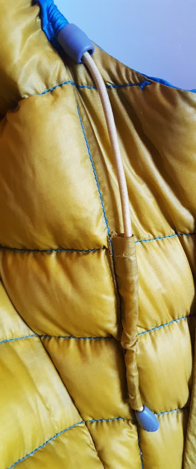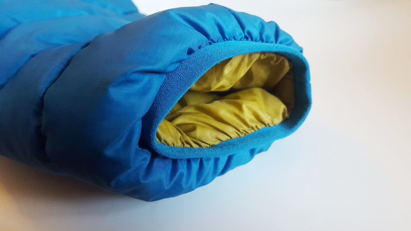 The hood cinches down easily, with elastic threaded in the inner of the collar, meaning you can do this with thick gloves on, with no need to pinch a toggle. There is no rear cinch on the hood, which I like, because I often rate up my sleep system in winter with a down jacket. This means you can sleep comfortably with the hood on and no annoyance from a rear toggle.