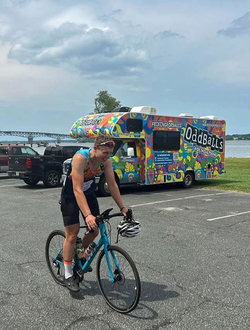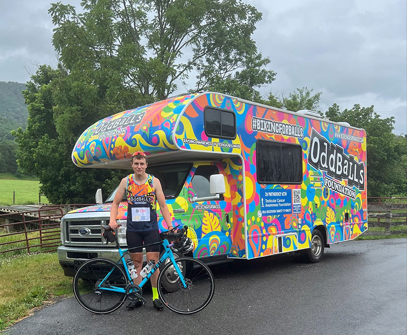 James Gray was inspired to take on the physical challenge of cycling across the USA as a way of raising funds for The Oddballs Foundation, after hearing about how many men are impacted by testicular cancer from a foundation ambassador during a talk at university. For his ride, James planned a route that allowed him to meet up with people who have beaten the disease as he cycled through their neighbourhood.