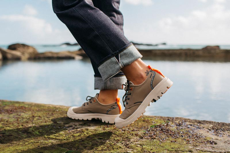 Well-known to Finisterre for their footwear’s durability, versatility and waterproof qualities before collaborating, Palladium continues to be the footwear of choice for many people working and adventuring in the brand’s coastal Cornwall home. As happy pounding the pavement as they are tackling a rugged coastal trail, the success and learnings from the inaugural collaboration provided the perfect platform to extend the range and release a new style for longer days in warmer climates.