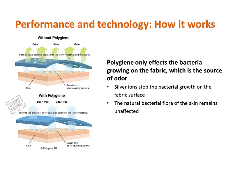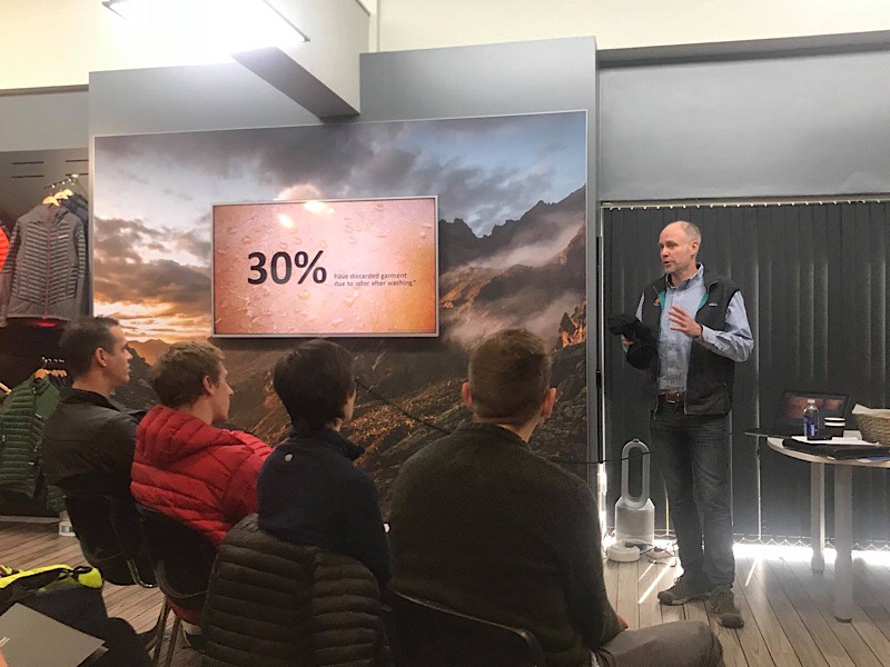 Stephen took us through the technology of Polygiene, it’s origins in the pharmaceutical industry and why they choose the outdoor industry. Essentially because we tend to sweat in whatever our chosen outdoor activity is, leading to us becoming a bit smelly! The science bit is they impregnate they fabric with silver salts, this is done as part of the production cycle meaning there is no extra energy used to carry out the process.