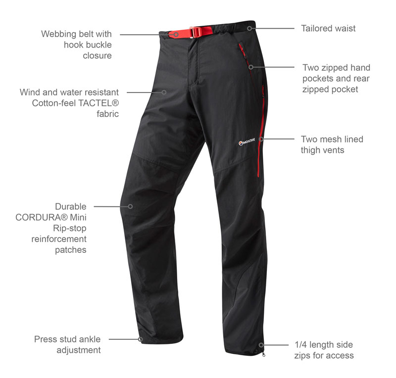 A modern classic, designed for 3 season multi activity mountain use. Combining tough, wicking and weather resistant TACTEL fabric with CORDURA mini-rip-stop reinforced knee and instep panels for added abrasion resistance. Their low weight, small pack size, fast drying properties and extremely durable reinforcements make them the ideal choice for any outdoor activity in the mountains.