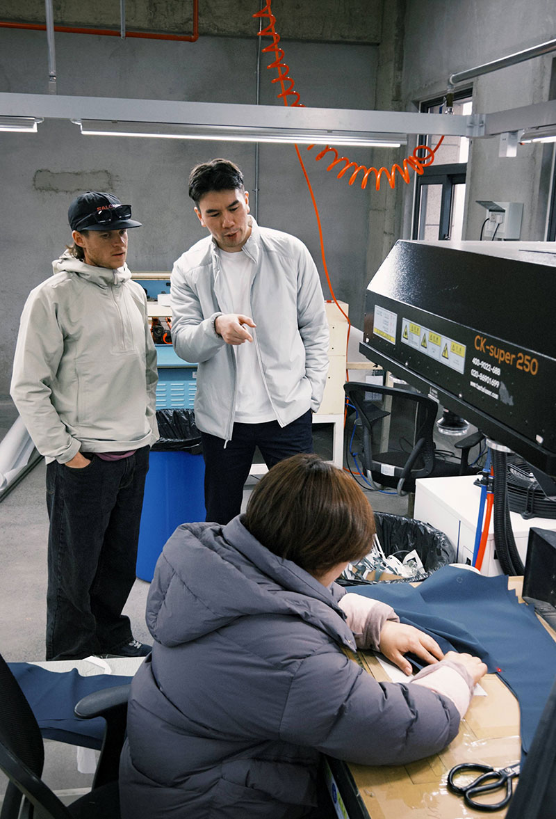 A few machines, worktables, rolls of technical material, and one clear focus: making gear that performs in vertical terrain.
