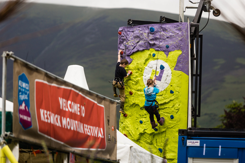Young visitors enjoy the climbing wall in the 2017 Keswick Mountain Festival Village 002