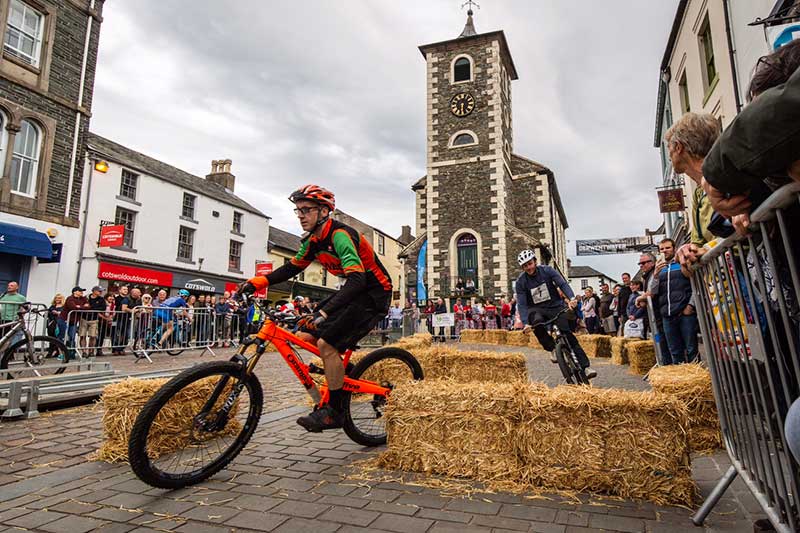 The Keswick Mountain Festival Town Trials will see participants tackle short-lapped loops of Market Square and its alleyways, in waves of adults or children. Each race will start part-way down the Market Square, with the bike races having a ‘Le Mans’ style running start. Runners and cyclists will have to negotiate sharp corners, zig-zags, steps, ramps and other obstacles such as covered hay bales, all accompanied by the rhythms of the Batala Samba band. The races will begin with single lap children’s races, followed by a four lap adults’ run, and concluding with a six lap adults’ bike race.