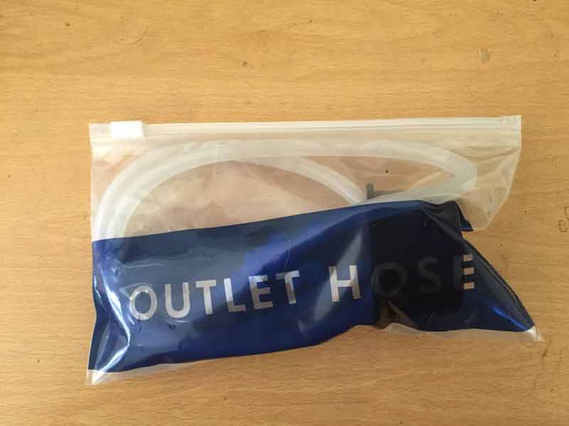 In use one end of the outlet hose connects to the outlet in the centre of the top of the main assembly, protected by a red cover on shipping and when not in use, with the other end going to the chosen container for storing the clean water. Using the quick connect adaptors the hose can connect directly to Camelback hydration bladders or with the bottle adapter it connects to a range of drinking bottles.
