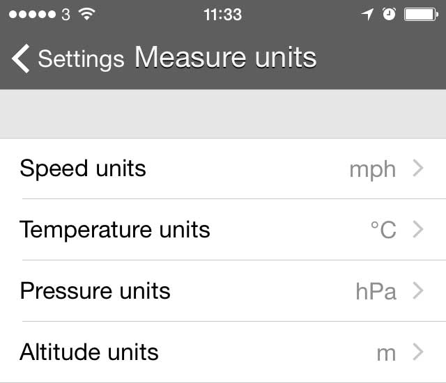 Below each measument an arrow gives access to further data including minimum and maximum readings and averages. The wind speed screen gives direction information both as an icon and a specific direction in degrees while the Temperature screen gives a WCT, or Wind Chill Temperature, reading in addition to Min, Max and Avg. With the Humidity screen you get the addition of a Dew Point reading and the Pressure screen gives a reading called QNH which displays the barometric pressure adjusted to sea level with the altitude given by the smartphone's GPS.