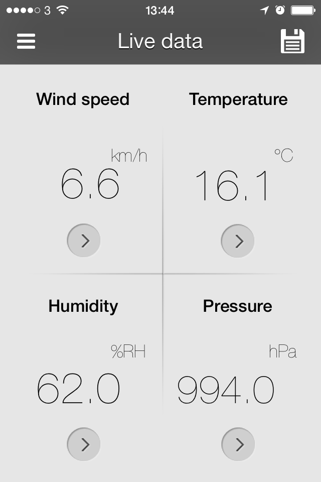 With the Windoo 3 you get 4 sets of measurements on-screen; Windspeed which is refreshed once per second, and Temperature, Humidity and Pressure which are refreshed every 3 seconds.