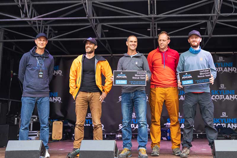 During the prize giving ceremony in the Event Village on Saturday afternoon, donations collected from entrants in the Salomon Skyline Scotland® 2021 races were handed to two local mountain rescue teams, Glencoe MRT and Lochaber MRT. Each team received £3,000.