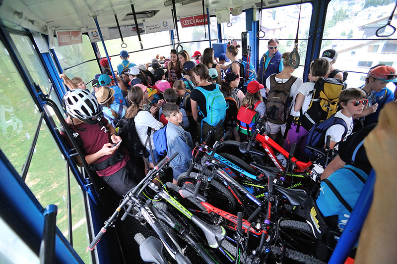 Gondola transporting hikers and bikers, St Moritz, Engadine, Switzerland.