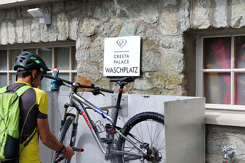 St. Moritz was one of the earliest ski resorts, a few miles down the road is Celerina, where The Cresta Palace Hotel has spent more than CHF 2 million updating its ski rooms and guest equipment storage facilities, to not only include heated lockers to dry ski boots, shoes and helmets, but incorporate bike storage and a bike wash area with both a water hose and compressed air line to dry bikes off with.