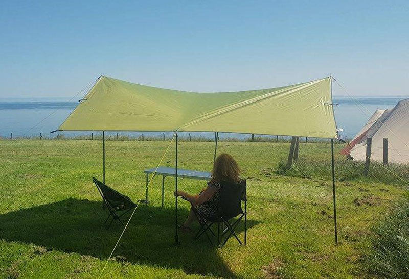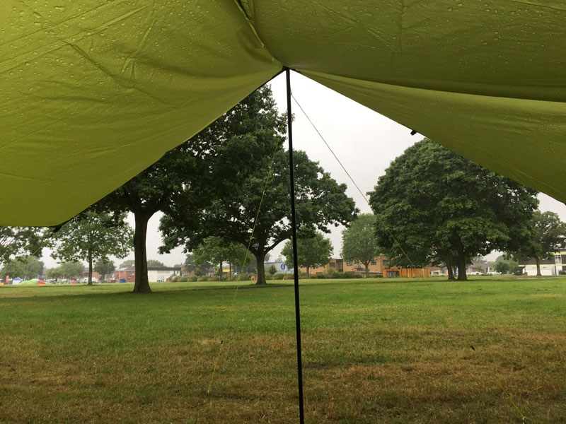 OK at almost 3.3kg it's not a lightweight tarp but if you're car based rather than backpacking it goes up in seconds, pretty much anywhere, and provides both sun and rain protection while giving you the room to spread out a bit.