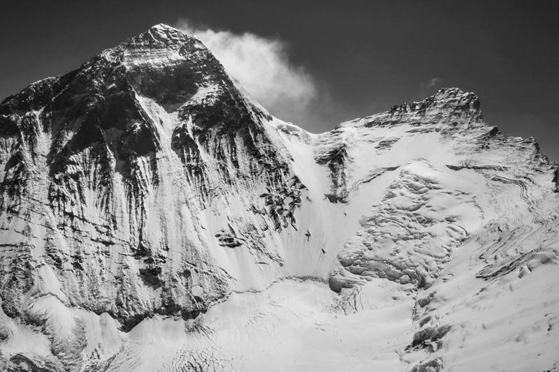 Everest (left) and Lhotse (right) – a rare view from high on Nuptse of the highest and 4th highest mountains in the world. Taken by Jon Gupta during their Nuptse attempt.