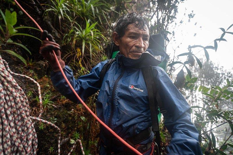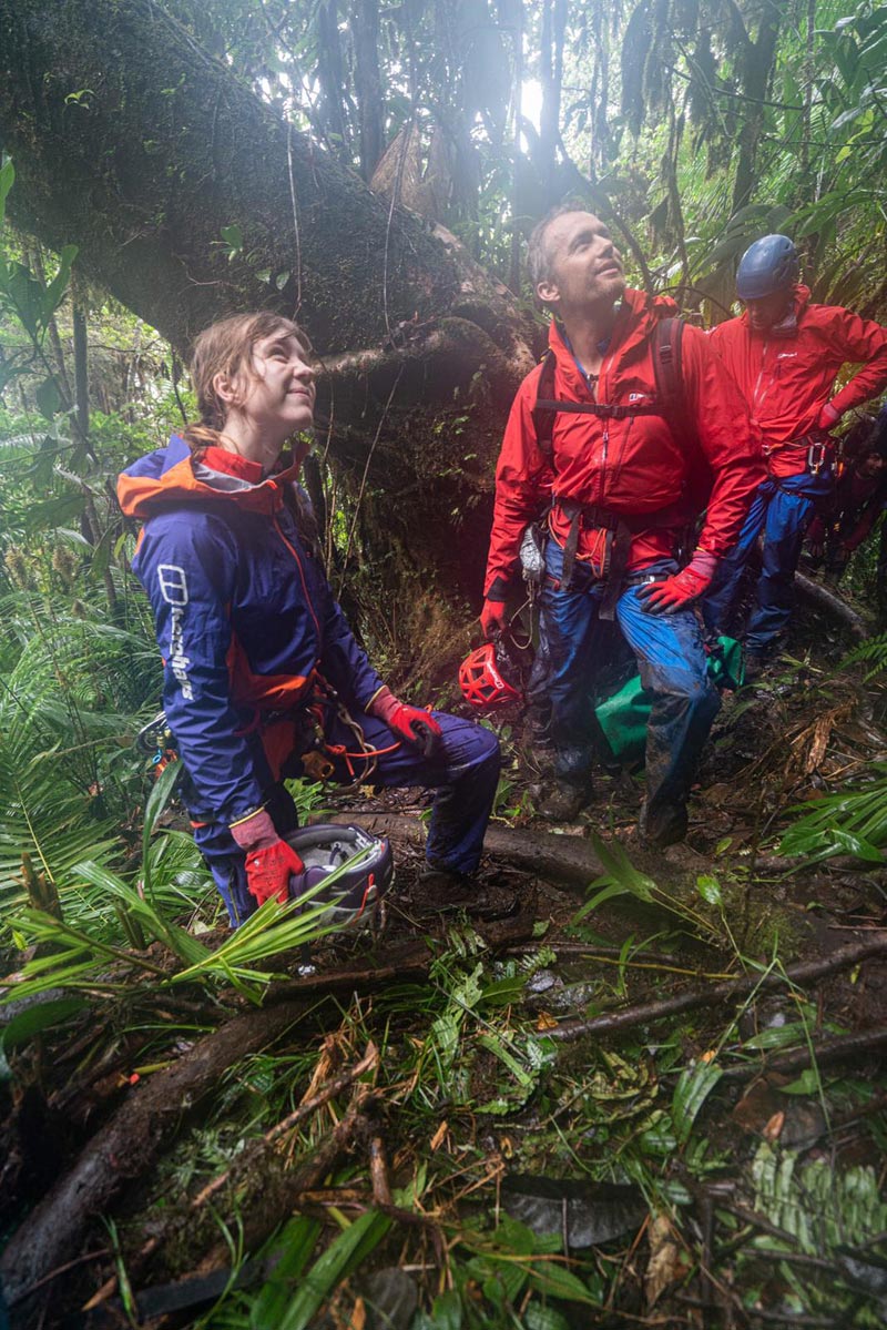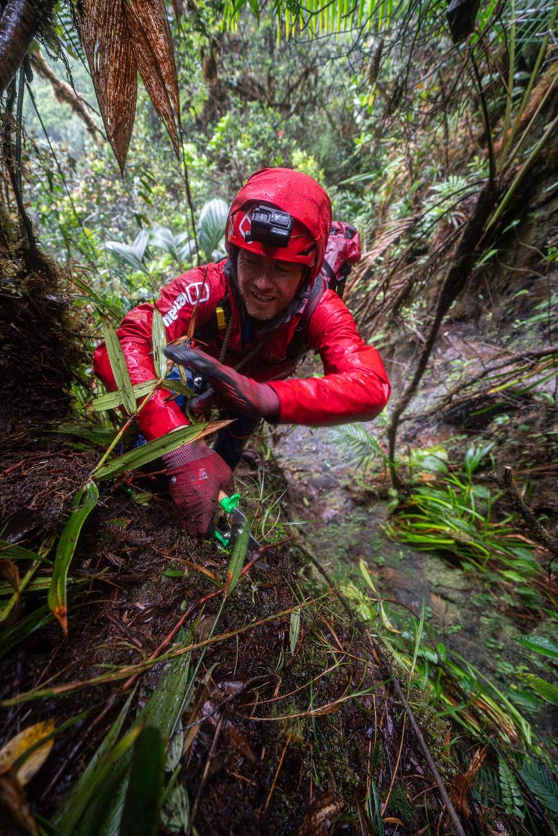 The plan now is to ferry all of the equipment to the top of the vertical ‘slime forest’, across the El Dorado swamp above, and through a bromeliad clad hill to the base of the prow. The slime forest and the hill above are like something from another world. The team is finding it difficult to describe just how muddy, slimy and ancient the place is. It took five hours to reach the top, with Leo breaking trail, with Anna, Waldo and Wilson keeping the porters safe, and Matt and Dan jumping between to get everything filmed and photographed.