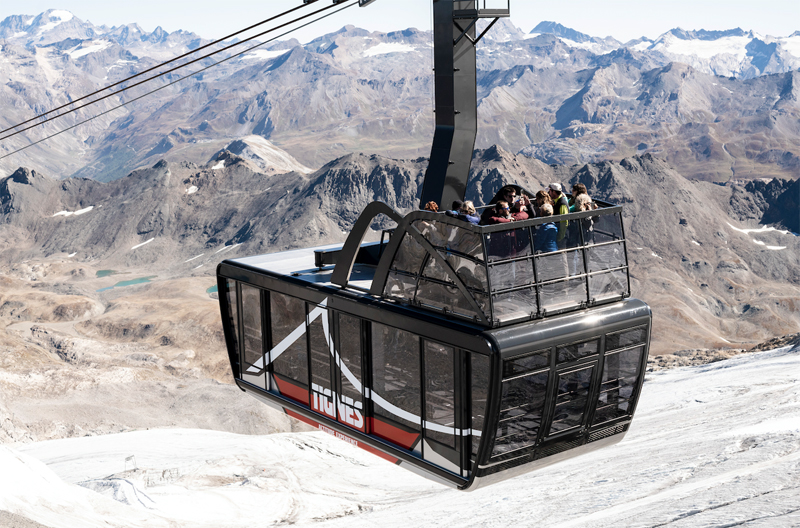 This exceptional new aerial tramway was designed to withstand the weather at an altitude of over 3,000 m, blending in perfectly with its surroundings and offering passengers a unique view of the incredible natural setting. It was designed in Switzerland by Garaventa AG and is equipped with state-of-the-art comfort and safety technologies. It will first open to skiers this winter once the ski area itself is opened. Due to extreme temperatures and heavy snowfall in winter at over 3,000 m, both open-top cabins will be open to the public in May.